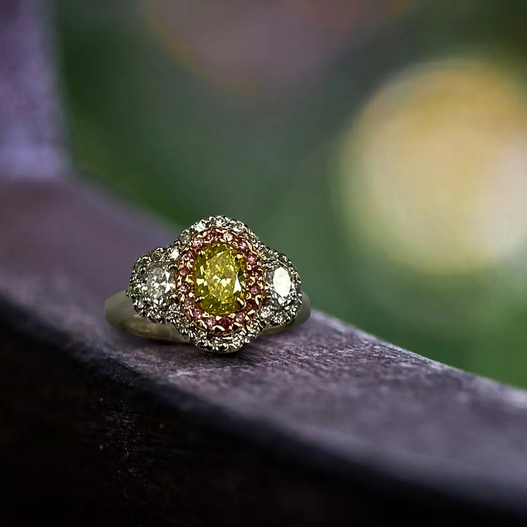 Platinum Ring With a Natural .75Ct Oval Diamond, Fancy Intense Green-Yellow - VS2 (GIA Report), 2 Natural Oval White Diamonds of .54Cttw, 16 Natural Round Pink Diamonds of .20Cttw, and 25 Natural White Round Diamonds of .40Cttw