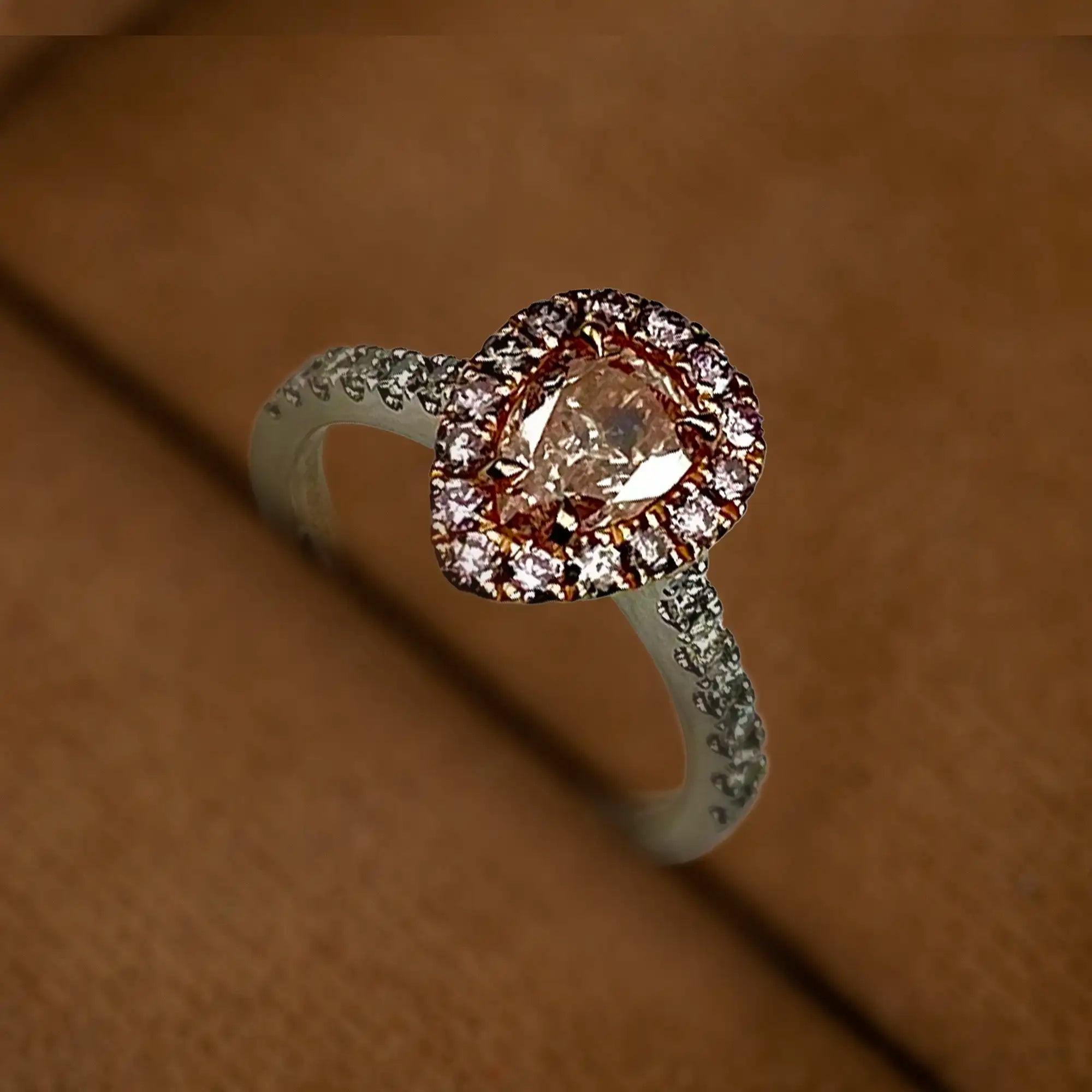 Platinum ring with pear modified brilliant Diamond of 1.00 Ct. natural, fancy light brownish-pink, even, VS2, GIA. With 12 round brilliant white Diamonds of .31 Ct.tw and 15 round brilliant natural pink Diamonds of .31 Ct.tw
